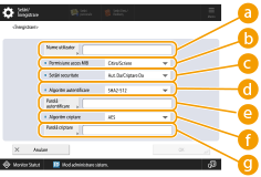 5 | Introduceți informațiile necesare. ![]() <Nume utilizator>Introduceţi un nume de utilizator utilizând caractere alfanumerice. ![]() Nu puteţi utiliza caracterele „Administrator” pentru un nume de utilizator pentru a vă înregistra. Dacă doriţi să utilizaţi caracterele „Administrator”, trebuie să setaţi <Fol. Administrator> la <Oprit> sub <Setări administrator>. <Permisiune acces MIB>Selectaţi privilegiile de acces MIB se la <Citire/Scriere> sau <Doar citire>. <Setări securitate>Setaţi o combinaţie de autentificare şi codificare. Selectaţi <Aut. Da/Criptare Da>, <Aut. Da/Criptare Nu> sau <Nr. aut./Nr. criptare>. <Algoritm autentificare>Selectați MD5, SHA1 sau SHA2 în funcție de mediul dvs. Pentru SHA2 selectaţi din patru lungimi hash (224 biţi, 256 biţi, 384 biţi sau 512 biţi). <Parolă autentificare>Introduceţi o parolă de utilizat pentru autentificare. Când este introdusă parola, se afişează <Confirmare>, pentru confirmare. Introduceţi parola din nou. <Algoritm criptare>Selectaţi <DES> sau <AES>, conform mediului dumneavoastră. <Parolă criptare>Introduceţi o parolă de utilizat pentru codificare. Când este introdusă parola, se afişează <Confirmare>, pentru confirmare. Introduceţi parola din nou. |