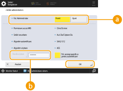 3 | Specificaţi setările necesare şi apăsaţi <OK>. ![]() <Fol. Administrator>Dacă utilizaţi Administrator, setaţi <Pornit>. <Parolă criptare>Dacă utilizaţi o parolă diferită de autentificare, deselectaţi <Fol. aceeaşi parolă ca pentru autentificare>, apăsaţi <Parolă criptare> şi introduceţi parola. ![]() Dacă „Administrator” este dezactivat, nu puteţi seta <Setări administrator> (setarea <Fol. Administrator> este fixată la <Oprit>). |