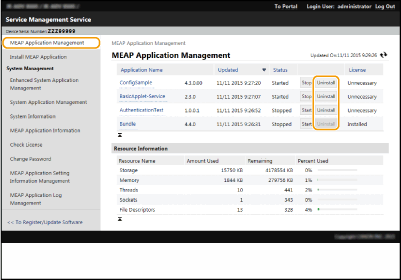 1 | Faceți clic pe [MEAP Application Management] [Uninstall] pentru aplicația care va fi dezinstalată.![]() |