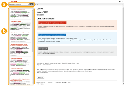 pentru a afişa ecranul de căutare. Conţine o casetă text pentru a efectua o căutare după cuvinte cheie şi pentru a găsi pagina pe care o căutaţi.