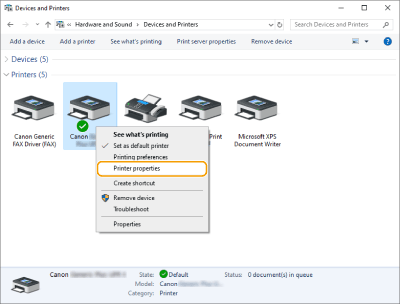 Faceţi clic dreapta pe simbolul imprimantei aparatului şi clic pe [Printer properties].