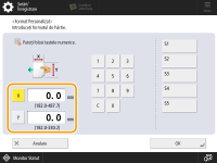 2 | Selectați tipul plicurilor încărcate în magazia de hârtie. Dacă tipul de plicuri nu este corect setat, va apărea un blocaj de hârtie. Când utilizați plicuri cu dimensiuni personalizate, apăsați <Personalizat>  <Următorul>  introduceți dimensiunile plicului. Apăsați <X> sau <Y>  utilizați tastele numerice pentru a introduce lungimea dimensiunii respective. |
