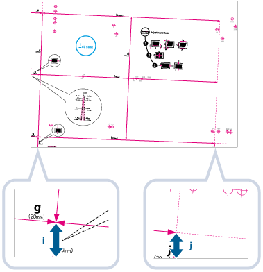1 | Verificaţi poziția imaginii pe hârtia de la ieșire. În acest exemplu, lungimea <h> este de 360,0 mm, <i> este 21,0 mm, iar <j> este 20,5 mm. |