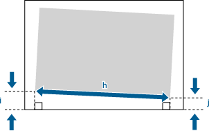 2 | Măsurați și introduceți valorile următoarelor elemente  apăsați <OK>. Utilizând următoarele trei valori numerice, aparatul face reglajele automat astfel încât suprafaţa de imprimare să fie paralelă la o foaie de hârtie. <h>Introduceți lungimea măsurată a părții din stânga în zona de imprimare. <i>Introduceţi lungimea de la muchia de avans din stânga a suprafeţei de imprimare la marginea din stânga a hârtiei. <j>Introduceţi lungimea de la extremitatea posterioară stânga a suprafeţei de imprimare la marginea din stânga a hârtiei. Urmând exemplul, setarea unei lungimi de 360,0 mm pentru <h>, 21,0 mm pentru <i> și 20,5 mm pentru <j> determină corectarea automată a diferenței de aliniere de 0,5 mm. |