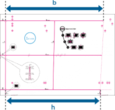 1 | Verificaţi poziția imaginii pe hârtia de la ieșire. În acest exemplu, lungimea <c> este de 250,0 mm, <b> este 360,0 mm, iar <h> este 355,5 mm. |