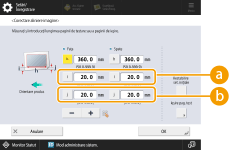3 | Introduceți valorile <g> și <a> pentru partea din față și partea din spate  apăsați <OK>. <g>Introduceți lungimea măsurată a marcajului <g> de pe pagina de testare. <a>Introduceți lungimea măsurată a marcajului <a> de pe pagina de testare. Urmând exemplul, introduceţi 20,5 pentru <g> și 21,0 pentru <a>. Diferenţa între <g> și <a> (0,5 mm) este corectată automat. |