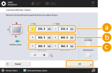 2 | Măsurați și introduceți valorile următoarelor elemente  apăsați <OK>. Folosind următoarele trei valori numerice, un dispozitiv se reglează automat astfel încât zona de imprimare distorsionată să poată fi corectată. <c>Introduceți lungimea măsurată a marginii frontale a zonei de imprimare în raport cu direcția de alimentare. <b>Introduceți lungimea măsurată de la muchia de avans din dreapta a zonei de imprimare până la capătul din spate dreapta al zonei de imprimare. <h>Introduceți lungimea măsurată de la muchia de avans din stânga a zonei de imprimare până la capătul din spate stânga al zonei de imprimare. Urmând exemplul, setarea unei lungimi de 250,0 mm pentru <c>, 360,0 mm pentru <b> și 355,5 mm pentru <h> determină corectarea automată a diferenței de aliniere de 0,5 mm. |