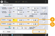 1 | Setați raportul de mărire/micșorare (%) pentru <Zoom (f)> și <Zoom (d)> pe ecranul <Reglare poziţie imagine>  apăsați <OK>. <Zoom (f)>Măreşte sau micşorează imaginea pe direcţia paralelă cu direcţia de alimentare, conform raportului introdus. <Zoom (d)>Măreşte sau micşorează imaginea pe direcţia perpendiculară pe direcţia de alimentare, conform raportului introdus. După caz, încercaţi să imprimați din nou pagina de testare şi verificaţi valoarea corecţiei. |
