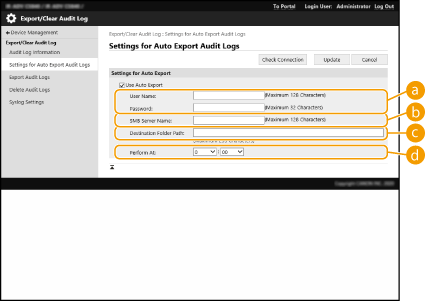După exportarea automată cu succes a jurnalelor de audit, jurnalele de audit acumulate vor fi șterse automat. Jurnalele de audit nu se pot șterge manual. După ce exportul și ștergerea automate ale jurnalelor de audit au reușit, se va genera fiecare jurnal. Dacă nu survin alte colectări în jurnal până la momentul următorului export automat, jurnalul de audit nu va fi exportat automat. Puteți să exportați jurnalele de audit și manual, din Remote UI (IU la distanță). Exportul unui jurnal ca fişier Dacă exportul automat nu reușește, aparatul va reîncerca de mai multe ori. Dacă exportul automat nu reușește nici măcar odată, pe panoul de control al aparatului se afișează un mesaj de eroare. Specificați un server SMB pentru Windows Server 2012 sau ulterior sau pentru Windows 8 sau ulterior. Dacă aparatul este oprit, exportul nu se va efectua chiar dacă a sosit momentul specificat. De asemenea, el nu se va efectua în timp ce aparatul este în curs de recuperare. Dacă aparatul se află în modul Hibernare, se va recupera automat și va efectua exportul la momentul specificat. Rețineți că, dacă utilizați un server care nu acceptă comunicarea criptată SMB 3.0/3.1, datele jurnalelor de audit călătoresc necriptate pe căile de comunicare în timp ce se exportă automat. În funcție de mediul în care lucrați, exportul automat al jurnalelor se poate efectua după momentul specificat. |