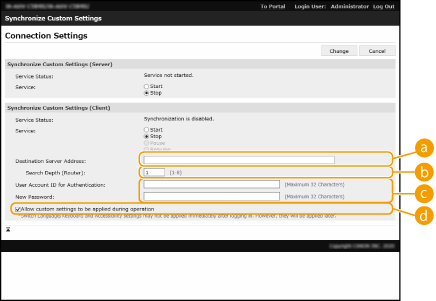 În următoarele cazuri, sincronizarea poate fi setată fără a efectua pasul 5. Când aparatele de sincronizat utilizează acelaşi router. Când opţiunea <Fol. Autentificare utilizator> este setată la <Pornit> la aparatul server (consultaţi <Fol. Autentificare utilizator>) şi Autentificare utilizator este setat ca serviciul de conectare (consultaţi Modificarea serviciilor de conectare) Când nu s-a introdus nimic în [User Account ID for Authentication:] la aparatele client (elementul este nul) Când serviciul pentru sincronizarea setărilor personalizate este pornit la aparatul server (dacă aparatul este unul server/client, setarea poate fi modificată prin pornirea simultană a serviciului server şi a serviciului client) Când există un singur aparat server pentru sincronizarea setărilor personalizate în aceeaşi reţea Aparatul client nu se poate conecta prin căutare în următoarele situații. Introduceţi adresa IPv4 pentru adresa serverului destinaţie. Dacă setările de reţea ale sistemului server includ atât IPv4, cât şi IPv6, IPv6 are prioritate şi dispozitivul client dezactivează IPv6 |