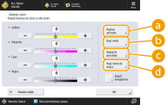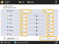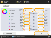 pentru <Toate culorile>. Pentru a seta fiecare culoare separat, utilizați butoanele din stânga și din dreapta fiecărei culori. Când reglarea este finalizată, apăsaţi <OK>.