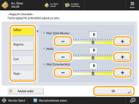 <Reglaj fin densitate>Selectaţi o culoare şi reglaţi nivelul de densitate al acesteia în funcţie de zona sa de densitate, utilizând butonul <-> sau <+>. Când reglarea este finalizată, apăsaţi <OK>.