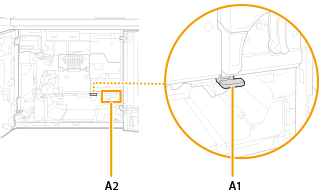 Există o zonă fierbinte în jurul ghidajului față-verso (dreapta) (A1) și al unității de evacuare față-verso (A2). Aveți grijă să nu atingeți ghidajul atunci când scoateți hârtia. Când deschideți și închideți fiecare ghidaj sau capac, aveți grijă să nu vă prindeți degetele în spațiul liber. |