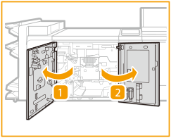 ![]() | Dacă hârtia este blocată, trageți-o ușor în direcția săgeții, ținând ghidajul (C3) deschis cu mâna. ![]() ![]() Când eliberați ghidajul (C3), acesta se închide. |