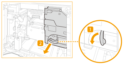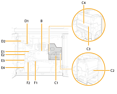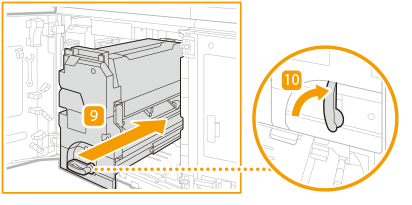 ![]() | Împingeți ușor unitatea de fixare înapoi în aparat, ținând levierul (C1). ![]() Când apăsați unitatea de fixare, levierul (C1) pe care-l țineți se poate mișca astfel încât să se ridice, dar acest lucru nu constituie o defecțiune. Împingeți-o până la capăt și treceți la pasul următor. |