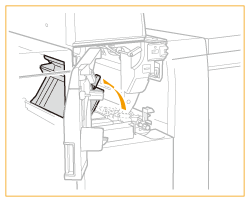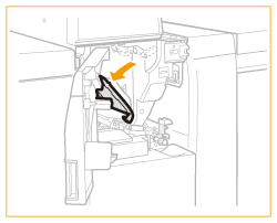 După ce îndepărtați hârtia lungă blocată și închideți capacul frontal al unității de inserare, este posibil să apară un ecran care vă solicită să deschideți capacul frontal al dispozitivului „Paper Folding Unit-K”. Puteți face acest ecran să dispară deschizând, apoi închizând capacul frontal al dispozitivului „Paper Folding Unit-K”.