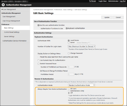 Acum puteți solicita utilizatorilor înregistrați să efectueze autentificarea în doi pași atunci când se conectează la Remote UI (IU la distanță). Bifați caseta de selectare pentru a solicita autentificarea în doi pași.