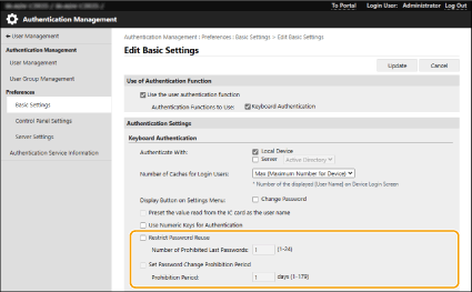 Acum puteți interzice utilizarea unei parole care a fost deja utilizată, atunci când utilizatorii își schimbă parola. Bifați caseta de selectare [Restrict Password Reuse] și configurați numărul de istoric al parolelor pentru a corespunde acestei setări.