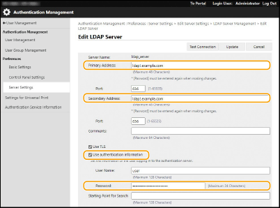 Dacă sunt specificate informații de autentificare, trebuie să reintroduceți parola atunci când modificați [Server Address] din [LDAP Server Settings] și înregistrați, sau când modificați [Server Address] și apăsați [Check Connection].