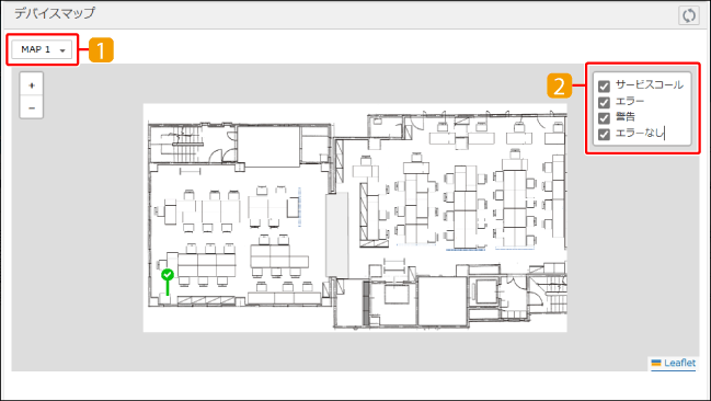 ピン | フロア図に配置されたデバイスの位置を表します。ピンの色はデバイスのステータス情報を示しています。 緑:エラーなし 黄色:警告 赤:エラー 濃い赤:サービスコール ピンをマウスオーバーすると、デバイス名を表示します。 ピンをクリックすると、エラーの詳細をポップアップで表示します。また、デバイスの詳細情報を画面左に表示します。詳細情報の右上にある   をクリックするとデバイス詳細情報を開閉できます。 |