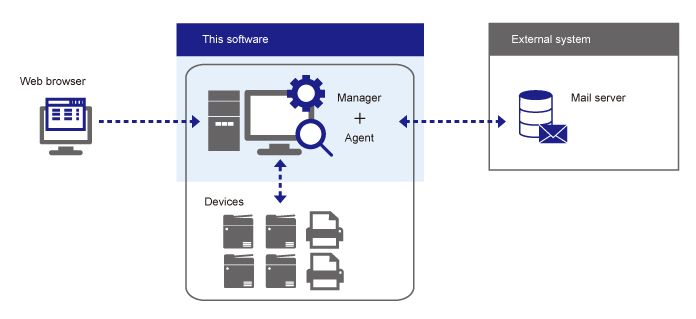 The Manager registers device information collected by the Agents to a database. It also controls tasks for devices and sends notifications to the Agents. Users can operate the Manager via a web browser.