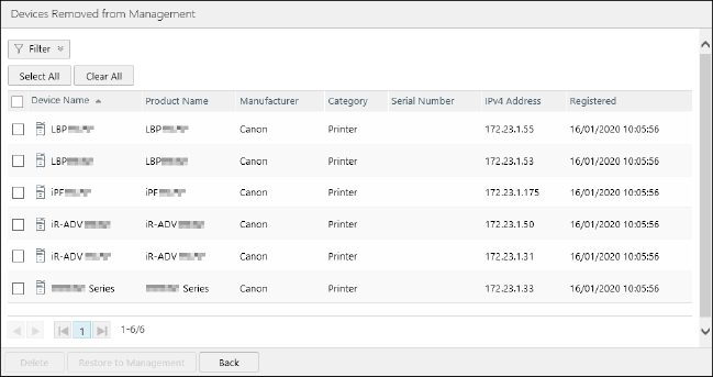 Removed devices from management can be checked on the [Devices Removed from Management] page. Click [Devices Removed from Management] on the top of the [Device List] page to display the [Devices Removed from Management] page. Devices displayed on the [Devices Removed from Management] page are not managed by this software.