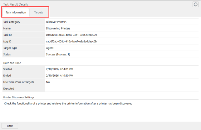 [Targets] tab | Displays the history for each target device or Agent. You can click the status in the list to check the detailed execution results for each target on the [Target Details] page. For batch tasks, [Status] displays the execution result of the final subtask that was executed. Therefore, even if "Success" is displayed for [Status] for a batch task, the subtasks executed before the final subtask may have ended with an error. The execution results for each subtask of a batch task are displayed in [Task List] on the [Target Details] page, as indicated below. With icon [ ]: Success[ ]: Error[ ]: Timeout[ ]: ExecutingWithout icon White background: Pending Gray background: Canceling |