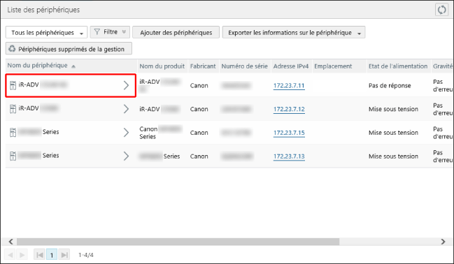[Vers les détails du périphérique] | Affiche la page [Détails du périphérique]. La page [Détails du périphérique] est la même que la page qui s'affiche lorsque vous cliquez sur le nom du périphérique sur la page [Liste des périphériques]. |