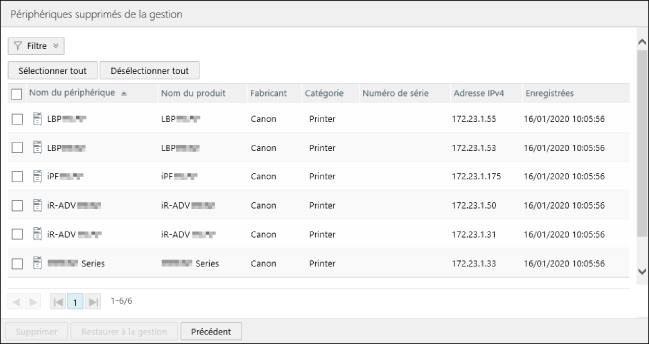 Sur la page [Liste des périphériques], cliquez sur [Périphériques supprimés de la gestion] en haut de la liste.