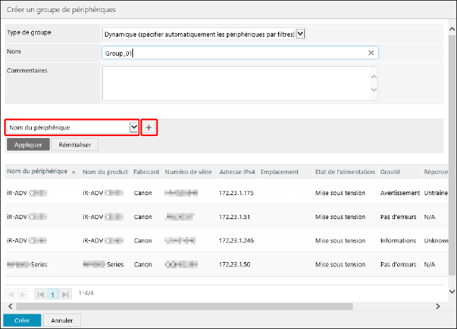 Un groupe contenant les périphériques satisfaisant les critères de filtrage est créé.