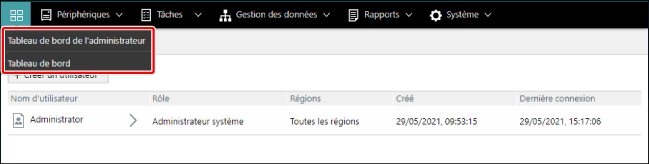 Le [Tableau de bord de l'administrateur] ne peut être affiché que par les utilisateurs auxquels est attribué le rôle d’administrateur. Le [Tableau de bord de l'administrateur] est un tableau de bord commun pour tous les utilisateurs avec le rôle d'administrateur système. Un [Tableau de bord] peut être créé pour chaque utilisateur. |