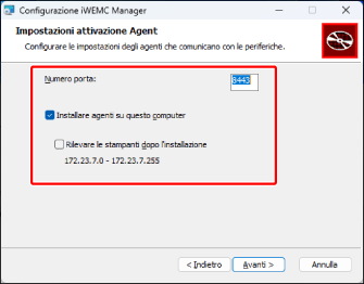 Quando si installa l’Agent sullo stesso computer del Manager, selezionare la casella di controllo [Rilevare le stampanti dopo l'installazione] per rilevare automaticamente stampanti dopo l’installazione.