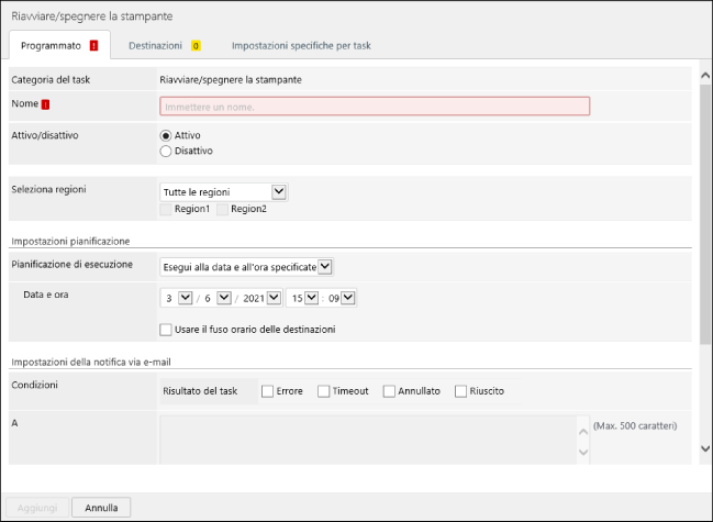È possibile impostare le regioni quando le periferiche rappresentano la destinazione del task. [Seleziona regioni] viene visualizzato quando si impostano le regioni. Per ulteriori informazioni, fare riferimento a quanto segue. |