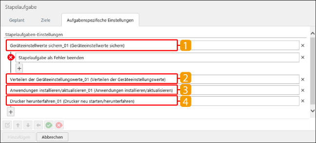 [Stapelaufgabe als Fehler beenden] | Wählen Sie diese Option, um den Prozess mit dem Ausführungsergebnis der Stapelaufgabe als "Fehler" zu beenden, ohne nachfolgende, eingestellte Unteraufgaben auszuführen. In Kombination mit [  ] und [  ] wird der Prozess nur für Geräte beendet, die die Bedingungen erfüllen. Die nachfolgenden Unteraufgaben werden für Geräte ausgeführt, welche die Bedingungen nicht erfüllen. |