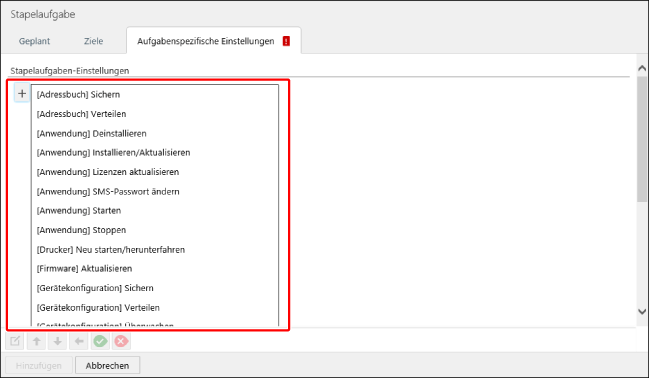 Fügen Sie auf der Registerkarte [Aufgabenspezifische Einstellungen] die auszuführenden Aufgaben nacheinander als Unteraufgaben hinzu, und bestimmen Sie ihre Reihenfolge.
