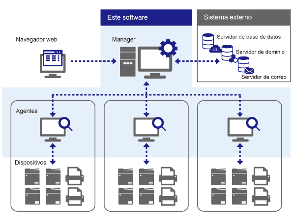 La información de los dispositivos en la red se recopila en el Manager a través de los agentes y se administra de forma centralizada.