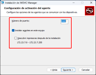 Cuando se instale el Agente en el mismo ordenador que el Manager, seleccione la check box [Descubrir impresoras después de la instalación] para detectar impresoras automáticamente tras la instalación.