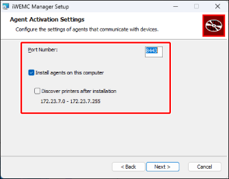 将 Agent 安装到安有 Manager 的计算机上时,请选中 [Discover printers after installation] 复选框,以在安装后自动发现打印机。