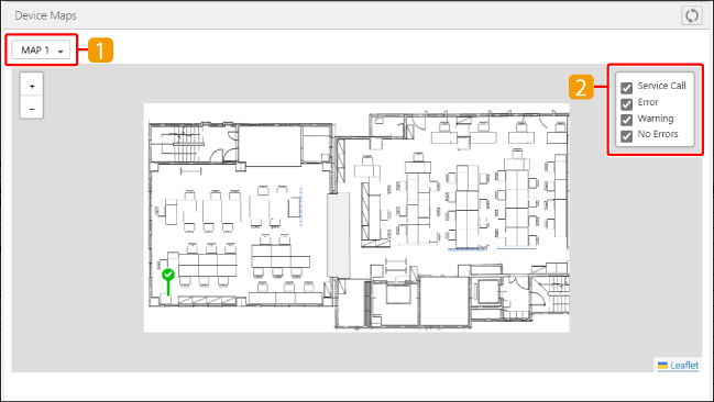 图钉 | 指示放置在楼层地图上的设备的位置。图钉颜色指示设备状态。 绿色:无错误 黄色:警告 红色:错误 深红色:服务呼叫 将鼠标放置在图钉上可显示设备名称。 单击图钉可在弹出窗口中显示错误详细信息。设备的相关详细信息也会显示在屏幕左侧。单击详细信息右上方的   可打开或关闭详细设备信息。 |