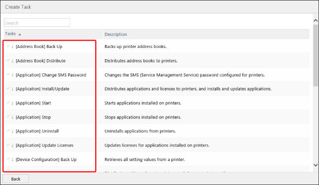 如果多个任务设为在相同日期和时间执行,但无法同时为同一台设备处理这些任务,则本软件会自动调整执行日期和时间,以避免任务重叠。例如,无法同时为同一台设备处理 [Distribute Device Setting Values] 和 [Back Up Address Books] 任务。如果这些任务设为同时执行,则本软件会自动调整任务的执行日期和时间,从而不会同时处理这些任务。 |